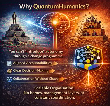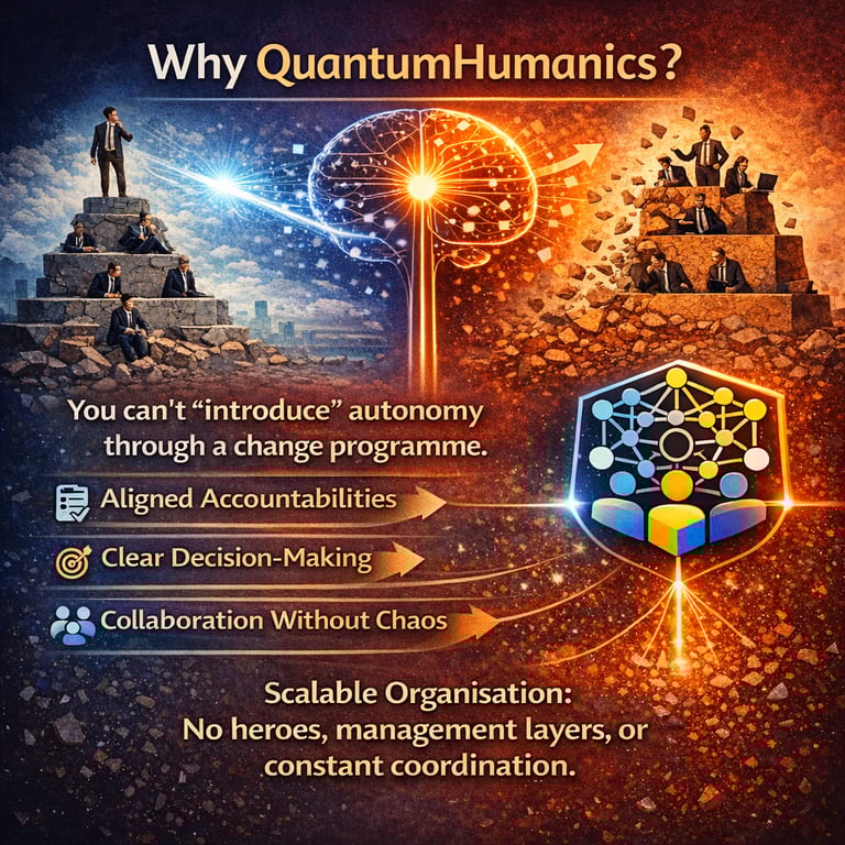QuantumHumanics builds an organisational form that remains scalable: less dependent on heroes, less dependent on management layers, and less dependent on constant coordination.